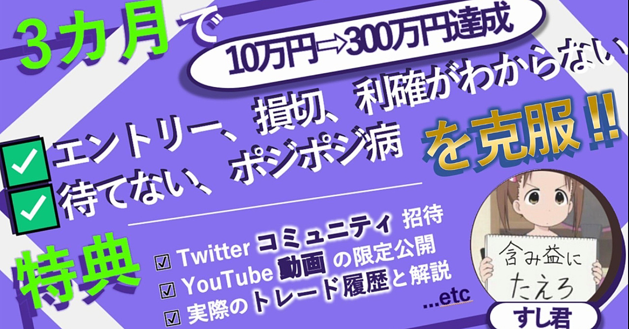 この記事を通して習得していただきたいこと挨拶こんにちは、海外移住専業トレーダーのすし君と申します。僕は星の数ほどの失敗を通し...4年かけて『10万円から300万円までの達成を2回。そのうち1回はリアルタイム&先出しでInstagramに投稿をする試み』もできる専業トレーダーにま