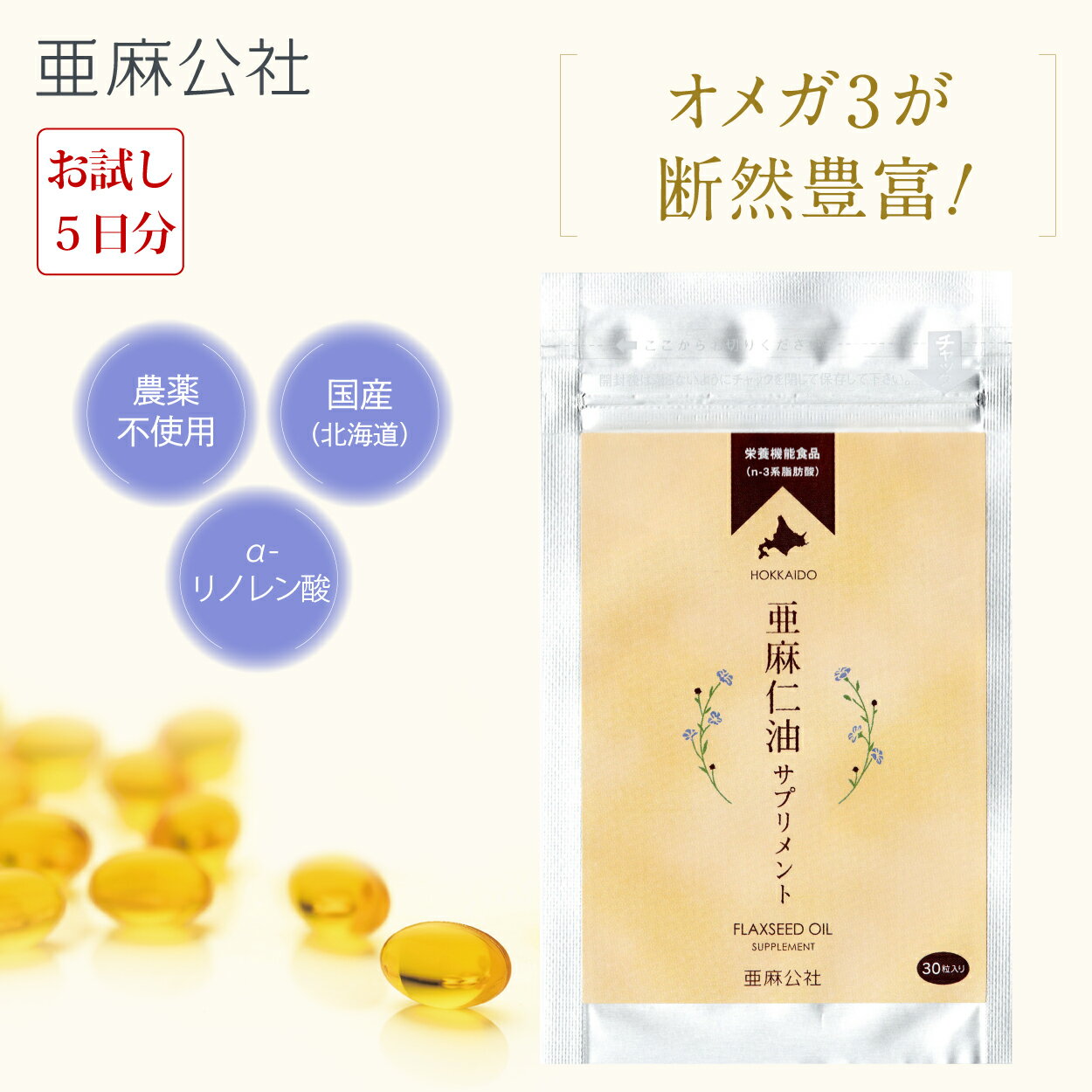 北海道産の亜麻仁を100%使用した「亜麻仁油サプリメント30粒」は、健康をサポートする栄養機能食品です。