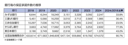 メガバンクと東京が本拠の地方銀行について、統計の公表が始まった2018年から最新の2024年までの保証承諾件数の推移をまとめました。