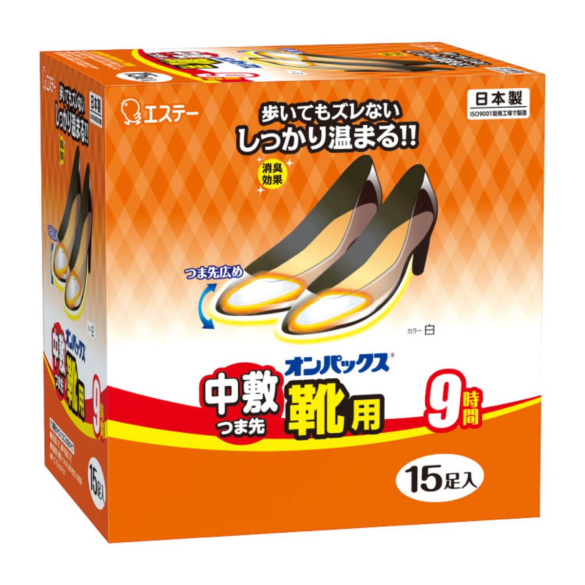 《製品仕様》●品名:使いすてカイロ ●用途:くつ専用(くつ下に入れるタイプ) ●材料名:鉄粉、水、活性炭、塩類、吸水性樹脂、木粉、バーミキュライト、鉱物系吸着剤●内容量:15足入●寸法:9.5cm×7cm●温度/持続時間:最高温度 45°C/平均温度 38°C●持続時間 9時間(くつの中での使用を想定した測定値)※表示の最高温度・持続時間は日本産業規格、平均温度は東京都条例に基づく測定値ですので人体にてご使用の場合は若干の差異があります。