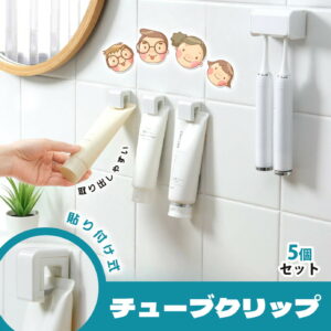 「クーポン利用で50%OFF」チューブクリップ 5個セット クリップ チューブ 歯磨き粉 洗顔料 タオル 粘着 粘着シート 片付け 収納 壁に固定 挟む 貼り付け式 洗面所 バスルーム 便利グッズ アイデア商品 浮かせる収納 収納術